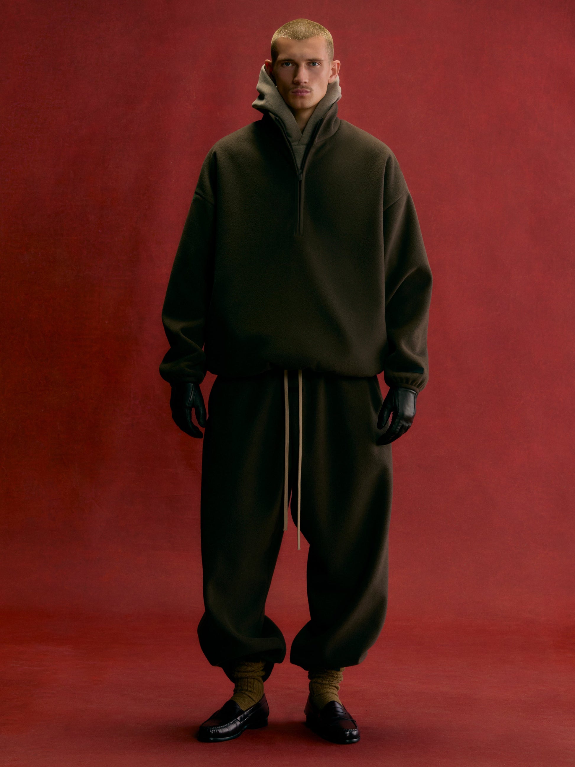 The Brushed Half Zip Pullover is constructed in a heavyweight, soft brushed yarn to provide warmth, comfort, and structure. The fit is relaxed in the body and sleeves. Functional details include a front half zipper, side seam pockets, and elastic binding on the sleeve, and waist hem.