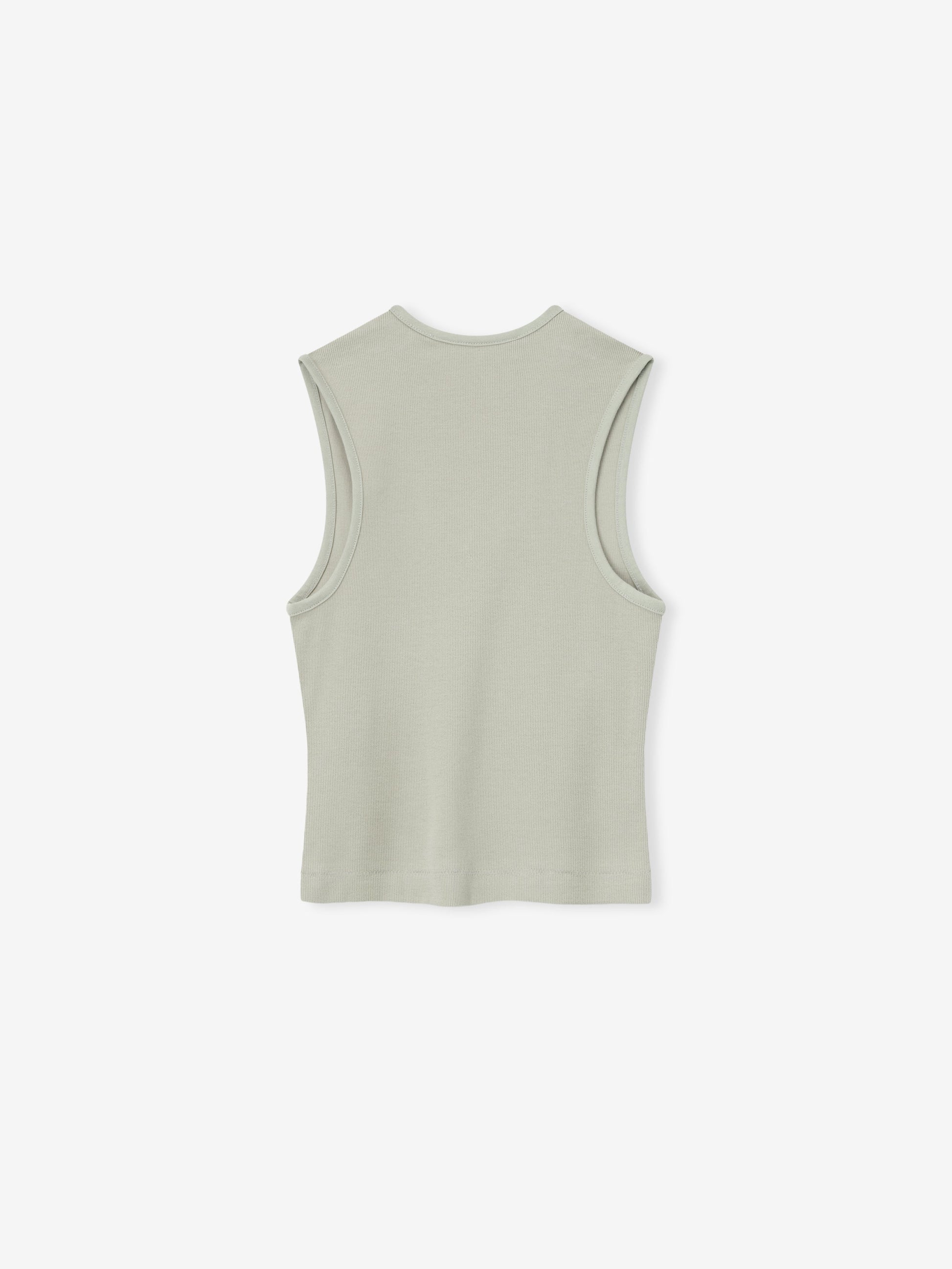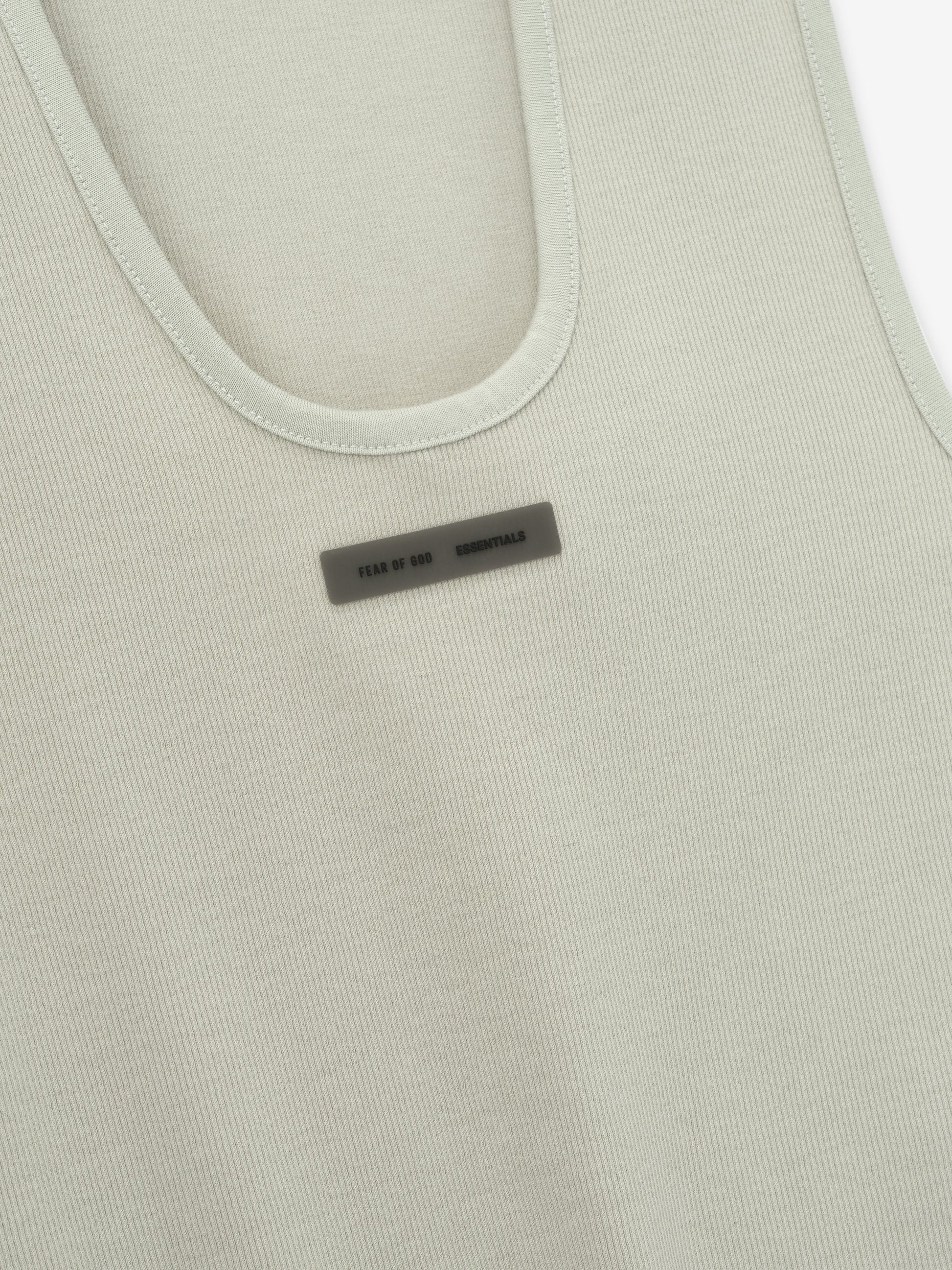 The Womens Rib Tank is crafted from a cotton/spandex jersey, offering a soft ribbed texture along with stretch and recovery. It features a U-neck design that contours to the body, ending at a cropped length. The tank showcases minimalist branding, highlighted by "Fear of God Essentials" translucent rubberized label located on the center front and back collar.