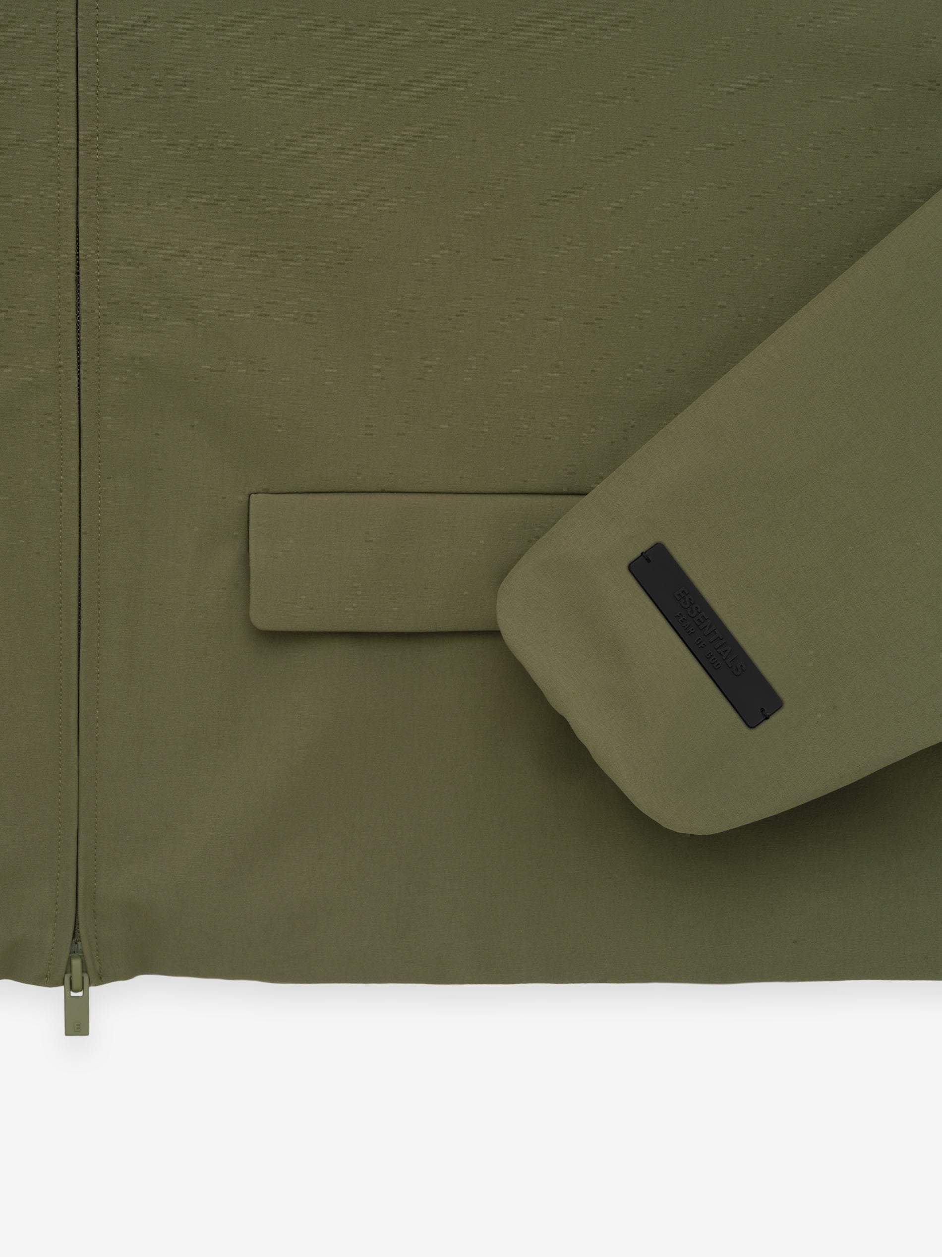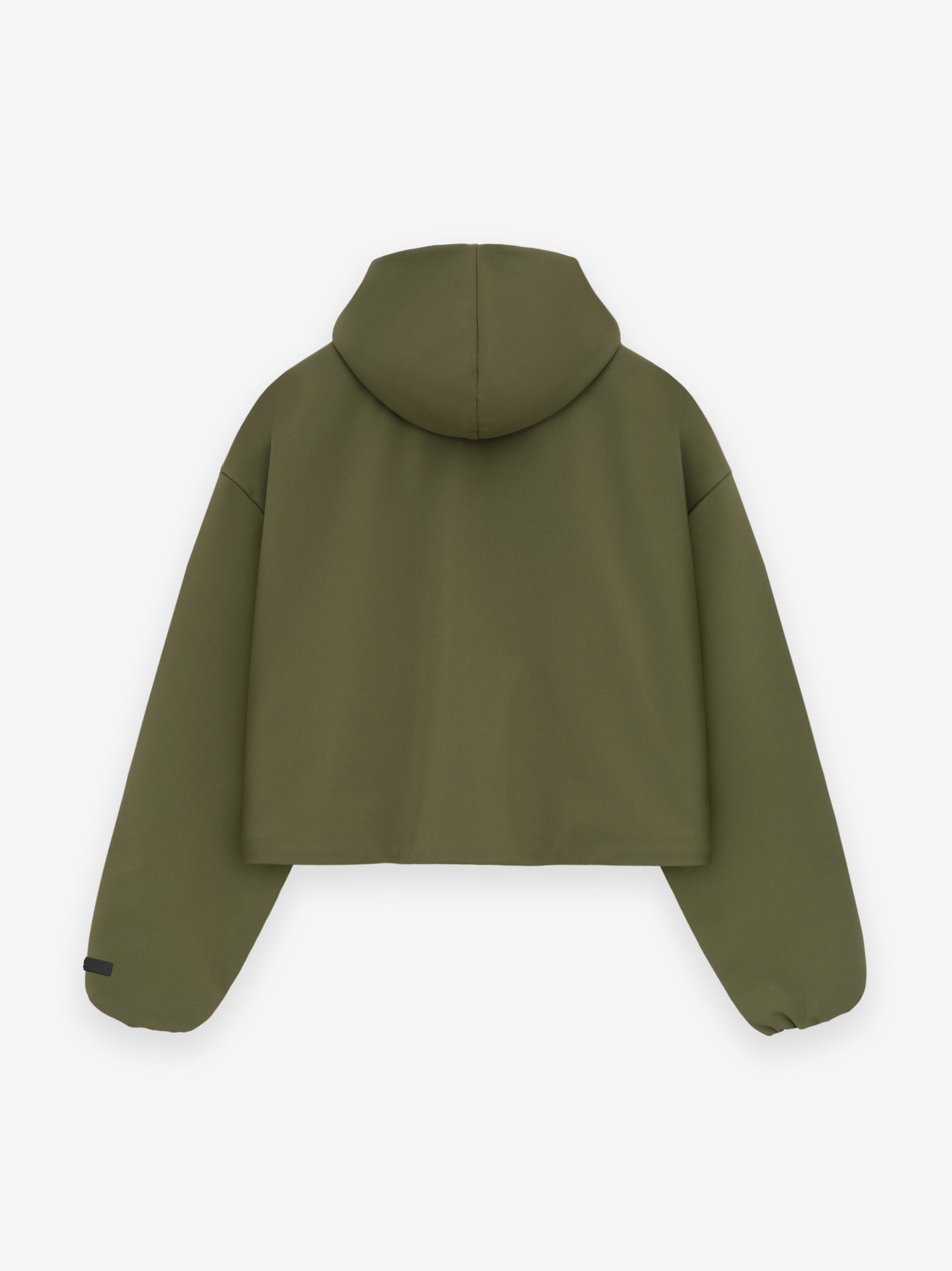 The Womens Bonded Nylon Hooded Anorak is made of double-layered stretch nylon for polished structure and a full perforated poly lining for comfort. The hoodie has a cropped, rounded style with full front zip, flap pockets, elastic cuffs and waist hem. The Essentials Fear of God black bar is stitched on the sleeve.