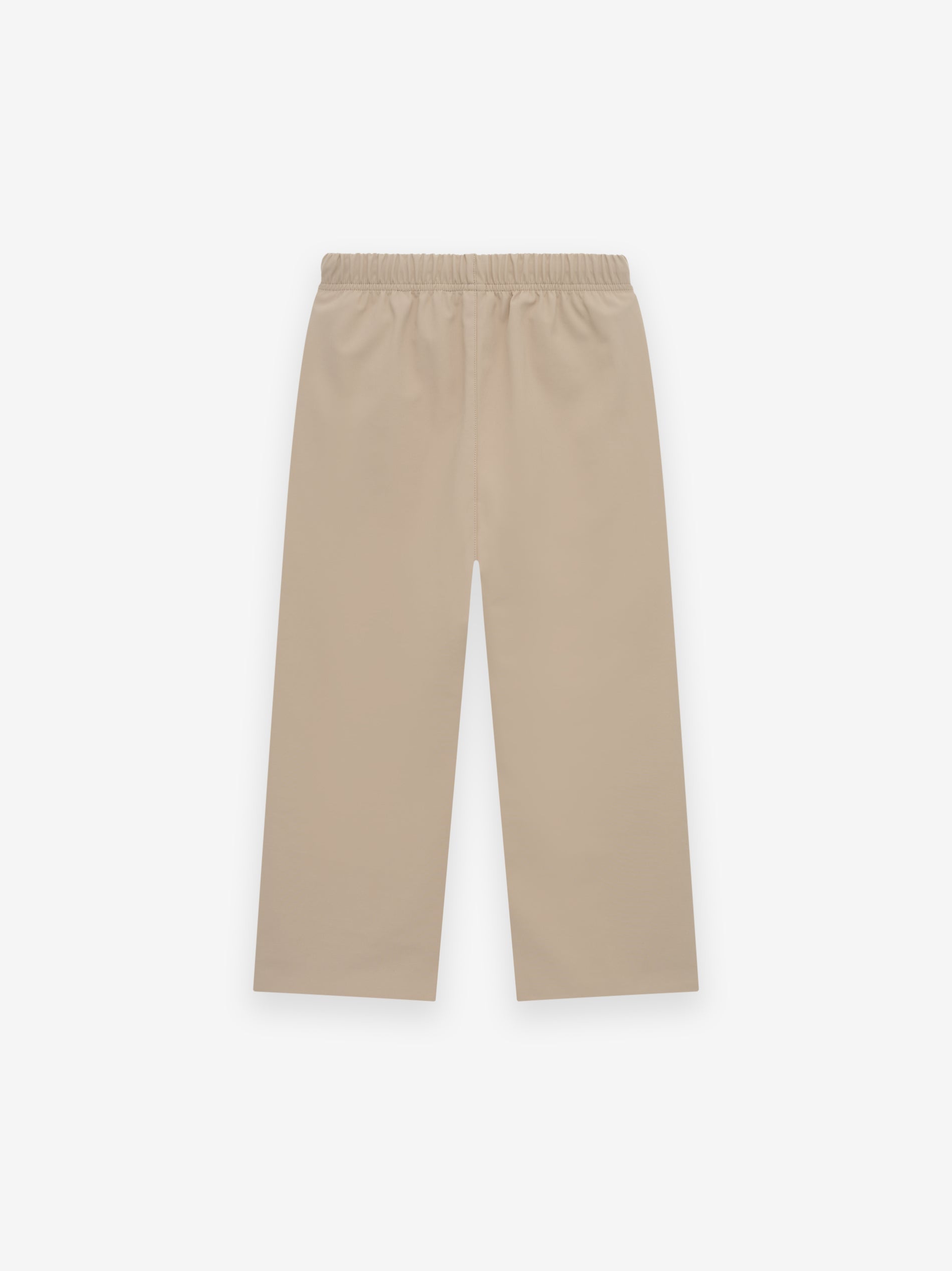 The Kids Bonded Nylon Utility Pant is made in double-layered stretch nylon for polished structure, and a full perforated poly lining for comfort. The wide leg fit pant has fatigue front pockets, encased elastic waistband, elongated drawstring, and side pockets. Minimalist branding is seen in the Essentials Fear of God black bar at center front.