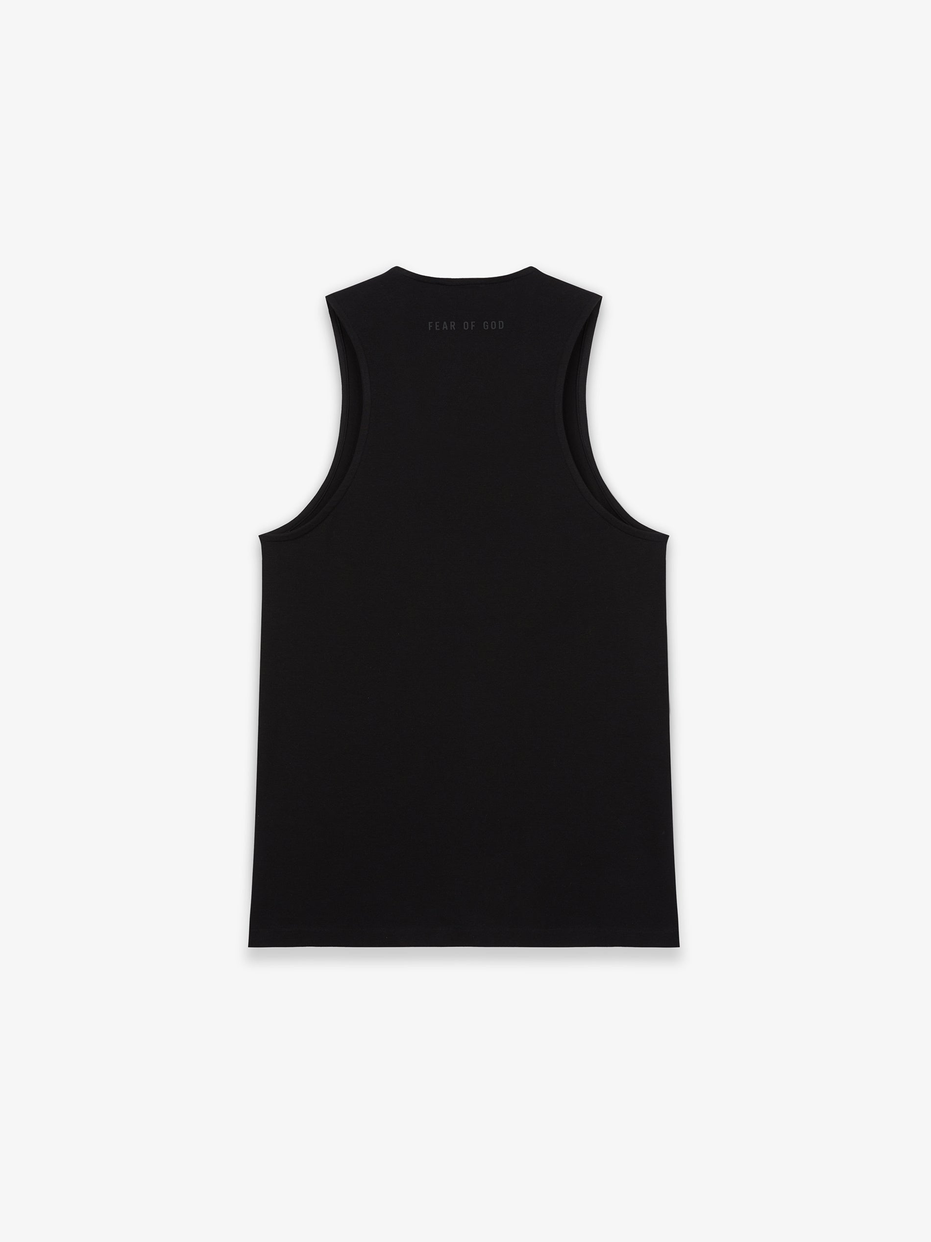 The Base Layer Tank Top is constructed from cotton-elastane rib-knit for stretch comfort. ?Additional key details include a U-neck with rib-knit trim, dropped arm holes, and a "FEAR OF GOD" logo is printed at the back collar.