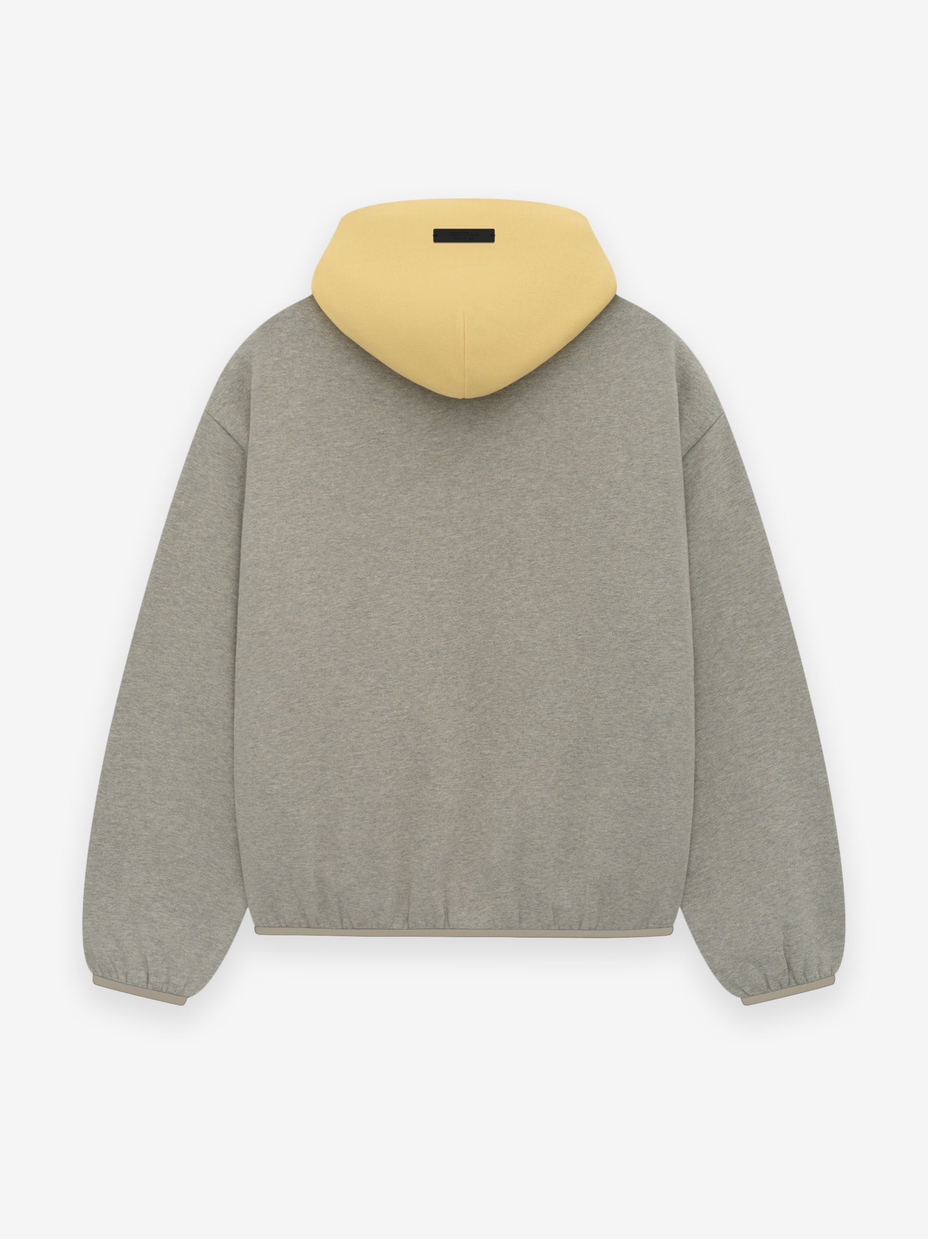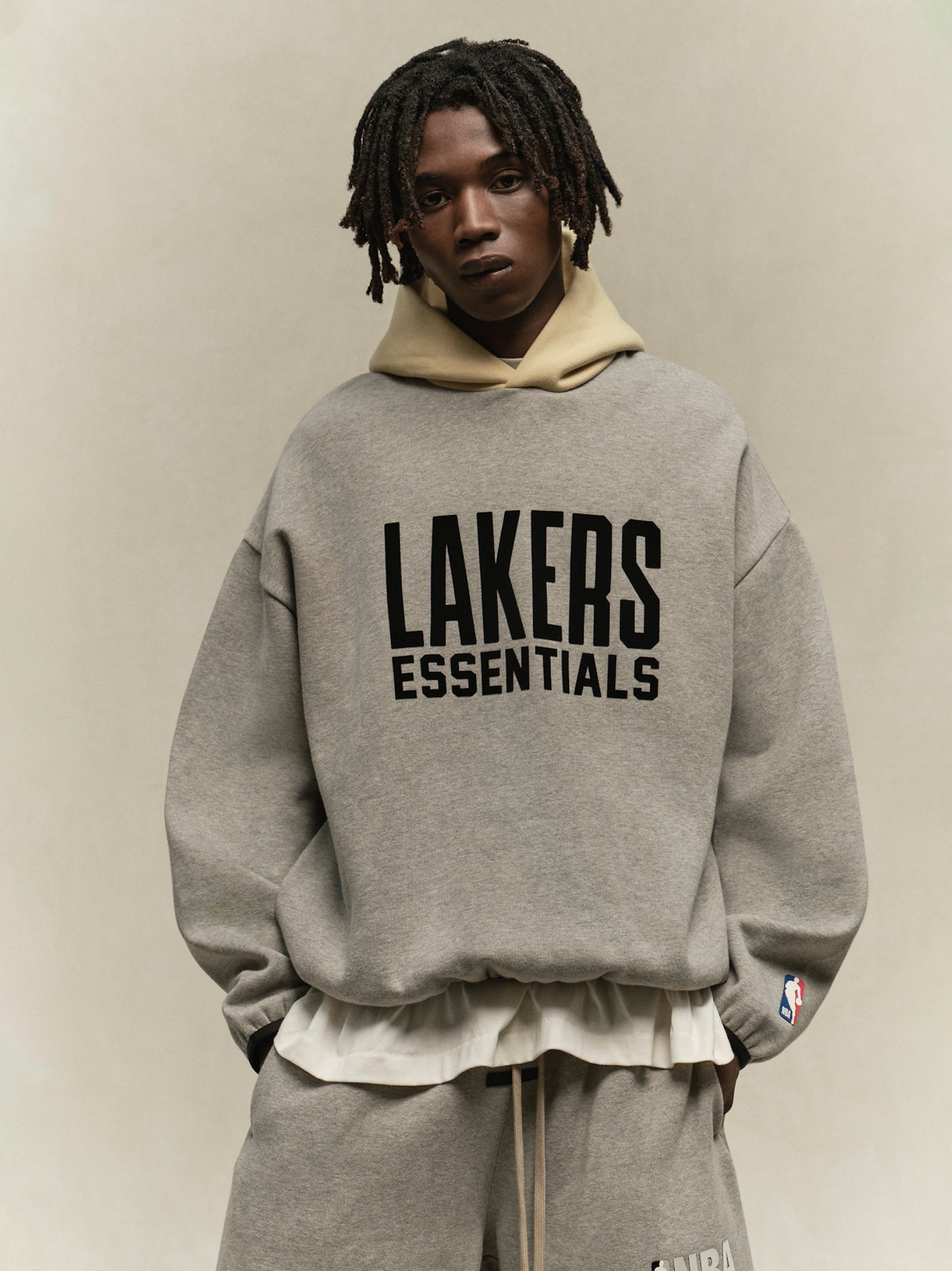 The Essentials Lakers hoodie is made from core fleece and showcases a trendy cropped silhouette. The front features a rubberized soft-touch "LAKERS ESSENTIALS" logo, along with the iconic NBA logo on the sleeve. Additional details include a contrasting double-layered hood, side seam pockets, and elastic bindings at the cuffs and hem. A rubberized "Essentials Fear of God" label is attached to the hood.