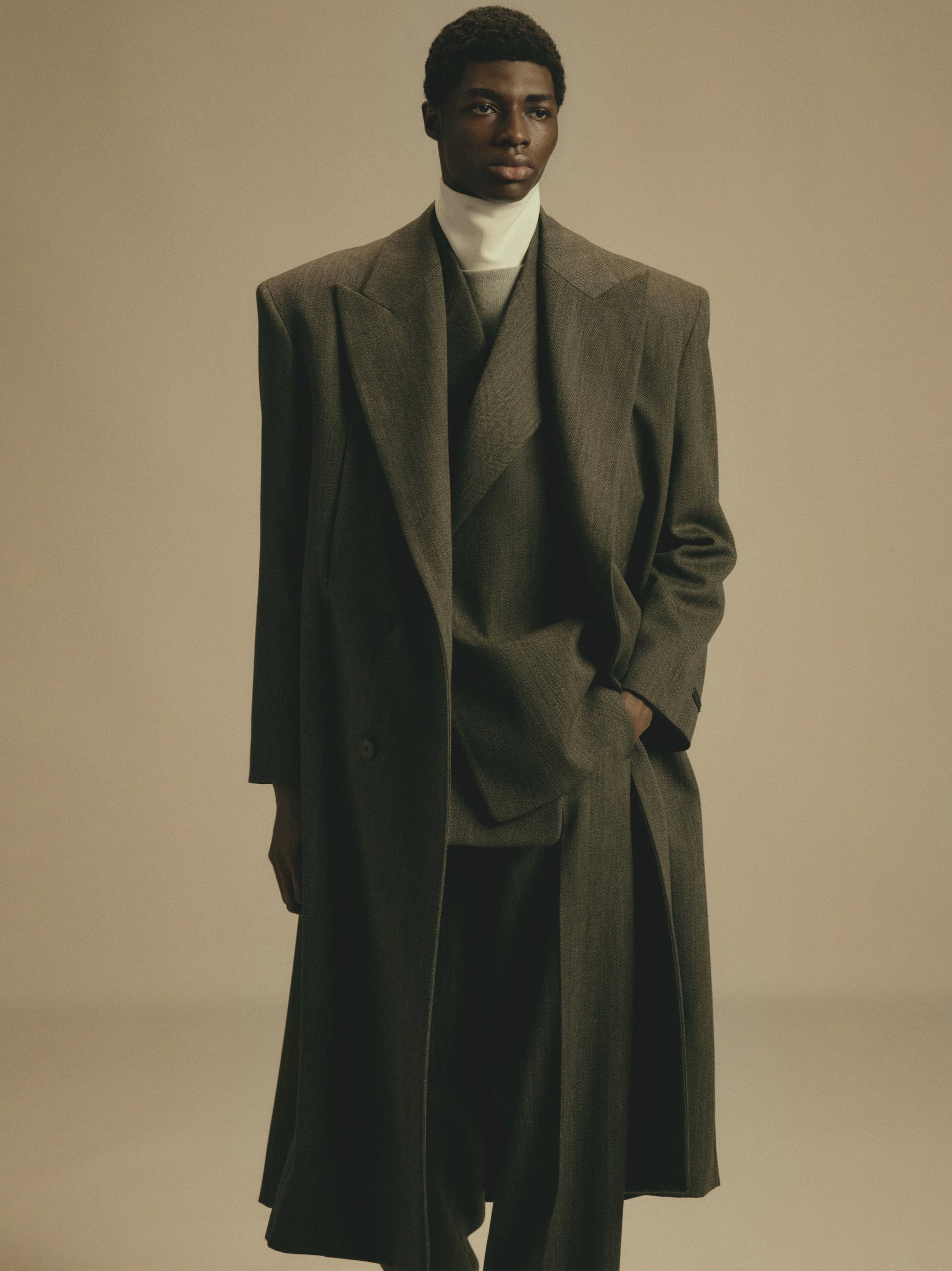 The Split Highneck Sweater is knitted in virgin wool-nylon for a warm hand with stretch comfort. The sweater has a relaxed fit, drop shoulders, knitted split high neck collar, cuffs and waist hem. A Fear of God label is stitched at the back collar.